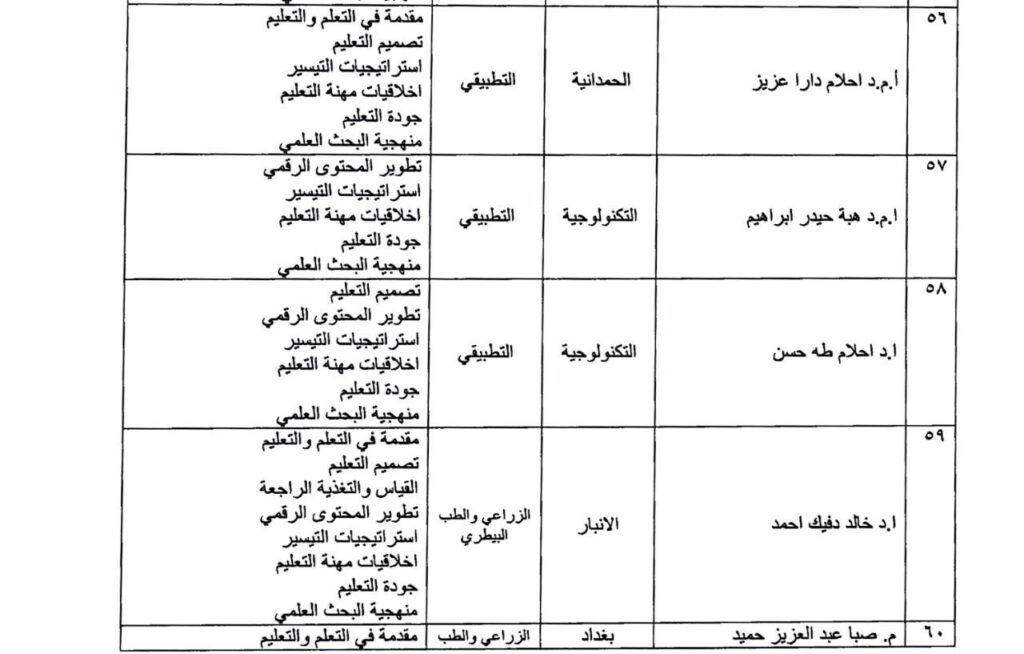 حاصلـة على شهادة “مدرب في طرائق التدريس للتخصص التطبيقي” ضمن الدورة الوزارية الثالثة لـ”إعداد المدربين TOT في طرائق التدريس وفق المنهاج المحدث“، التي أُقيمت ضمن مشروع البرنامج الحكومي لتطوير التعليم العالي في العراق، بإشراف وزارة التعليم العالي والبحث العلمي – دائرة الدراسات والتخطيط والمتابعة.