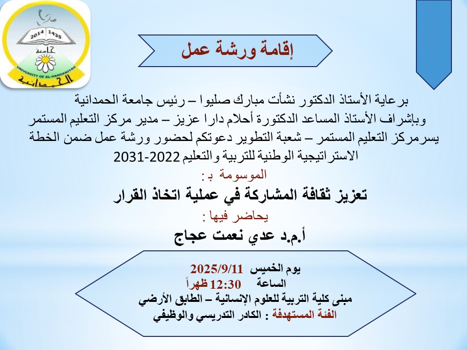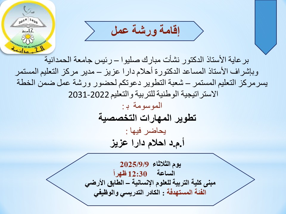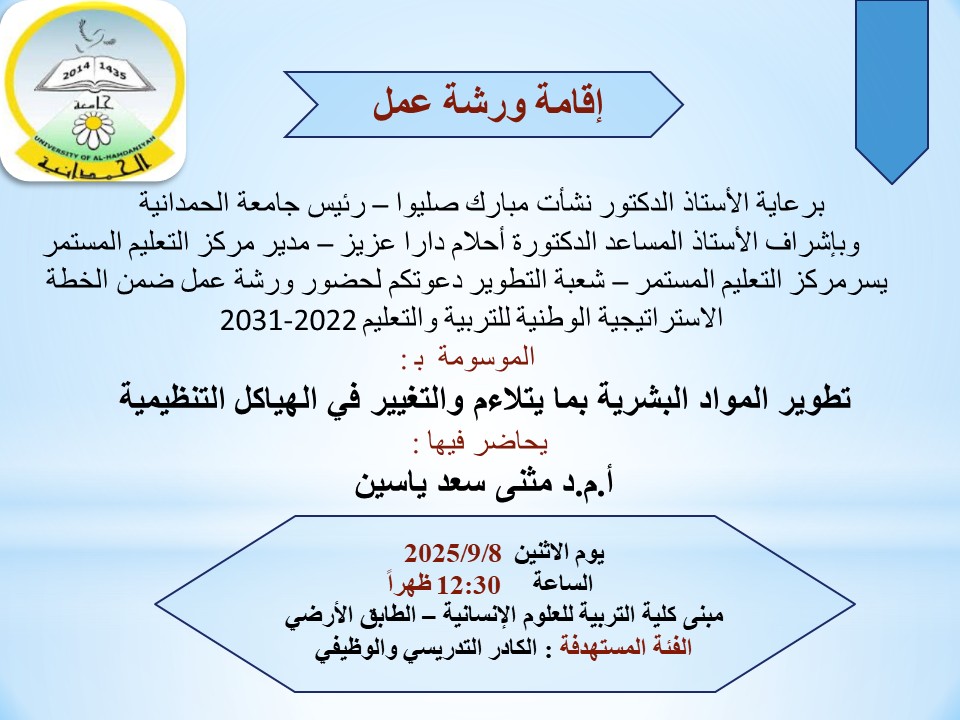 يسر مركز التعليم المستمر/شعبة التطوير، دعوتكم لحضور الورشة الاولى ضمن الخطة الاستراتيجية الوطنية للتربية والتعليم (2022-2031)، الموسومة بــ: