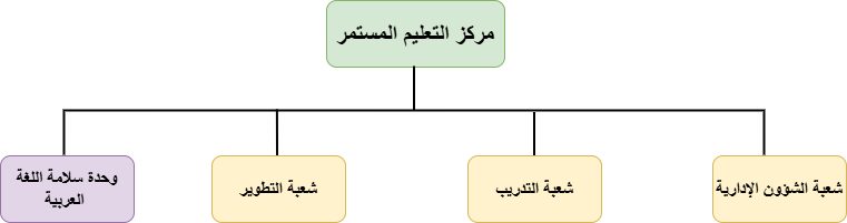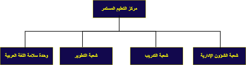 هيكلية المركز 1- يضم المركز ثلاثة شعب متخصصة : شعبة التدريب شعبة التطوير الشعبة الادارية 2- وحدة سلامة اللغة العربية
